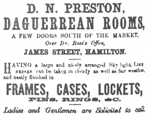 When confronted by old, undated family photographs, it is so easy to just put them back in a box or album and forget about them. But with a little detective work, it is sometimes possible to date them quite accurately.In the last Heritage Paper, the major categories of early photographs were outlined, so firstly try to place the family portrait into one of these groups, then the problem of dating must be tackled by painstaking comparison of the details of costume, accessories and background. This is best done with the help of photographs for which a date is known, rather than a book of Victorian costume as fashion in pioneer communities was often many years behind those of Europe.Women’s dress, in particular, can usually be dated at least within a ten-year span. The design of sleeves, cut of a skirt, detail of a collar and arrangement of hair or cap are all important clues. A crinoline will be the 1860s, a leg-of-mutton sleeve the mid 90s, bustles in the 70s and 80s. Young women’s clothes provide a better clue to prevailing fashion than dress of the elderly. In men’s dress also there were marked changes in fashion — the width and shape of lapels for instance should be examined and compared with photographs of a known date.Another approach to dating the photographs is possible when advertisements are included on the portrait at the base or on the reverse. Many early photographers only existed in business for a few years, so if a name is included, research within city directories, newspapers and city records can often pinpoint dates of business. This Heritage Paper lists the photographers of Hamilton and area, c1850-1860, who may have recorded the inhabitants of this area.