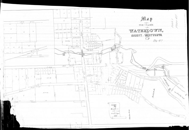 By the early 1830’s he had built a general store with his brother Absalom and a hotel. He also constructed a flour mill, an ashery, a sawmill and a carding mill within the next decade. By 1831, he had cleared enough land to employ a surveyor to draw plans for village lots. This survey, often called the Griffin Survey, records the early development of the village. In 1837 he purchased Lot 6 of Concession 3 from Col. Brown and extended his plan to cover 400 acres of land and over one mile of creek. The sale of village lots and the gradual industrialisation of the Grindstone Creek went hand in hand.