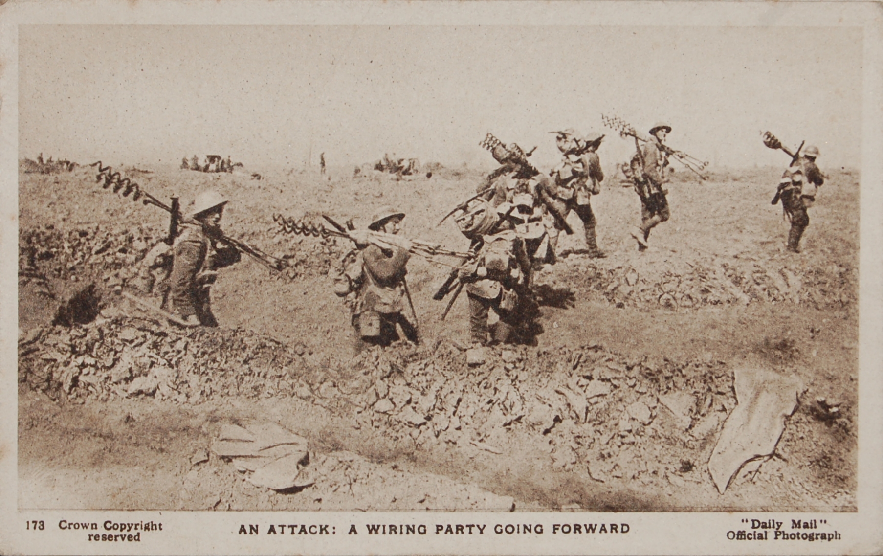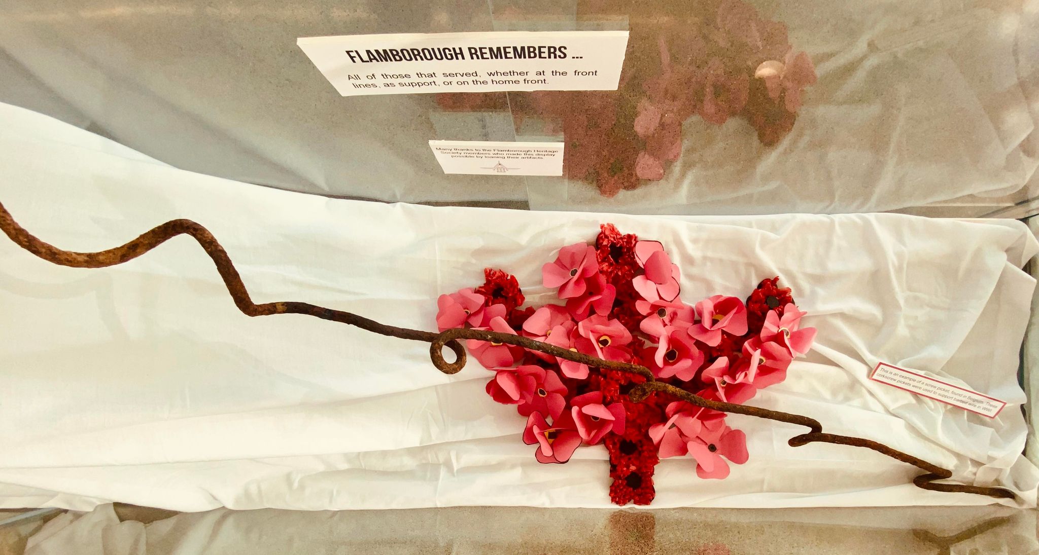 The screw picket, or 'cork-screw', sometimes 'pig's-tail', was a piece of equipment used to hold up barbed wire, twisted into the ground to hang barbed wire from. Pickets were previously used, but the noise from hammering them into the ground rendered wiring parties targets to enemy fire. The maple leaf in this central portion of the display was created with poppies made by elementary school students. Contributions of handmade poppies came from Flamborough Centre, Our Lady of Mount Carmel, and Mary Hopkins schools.
