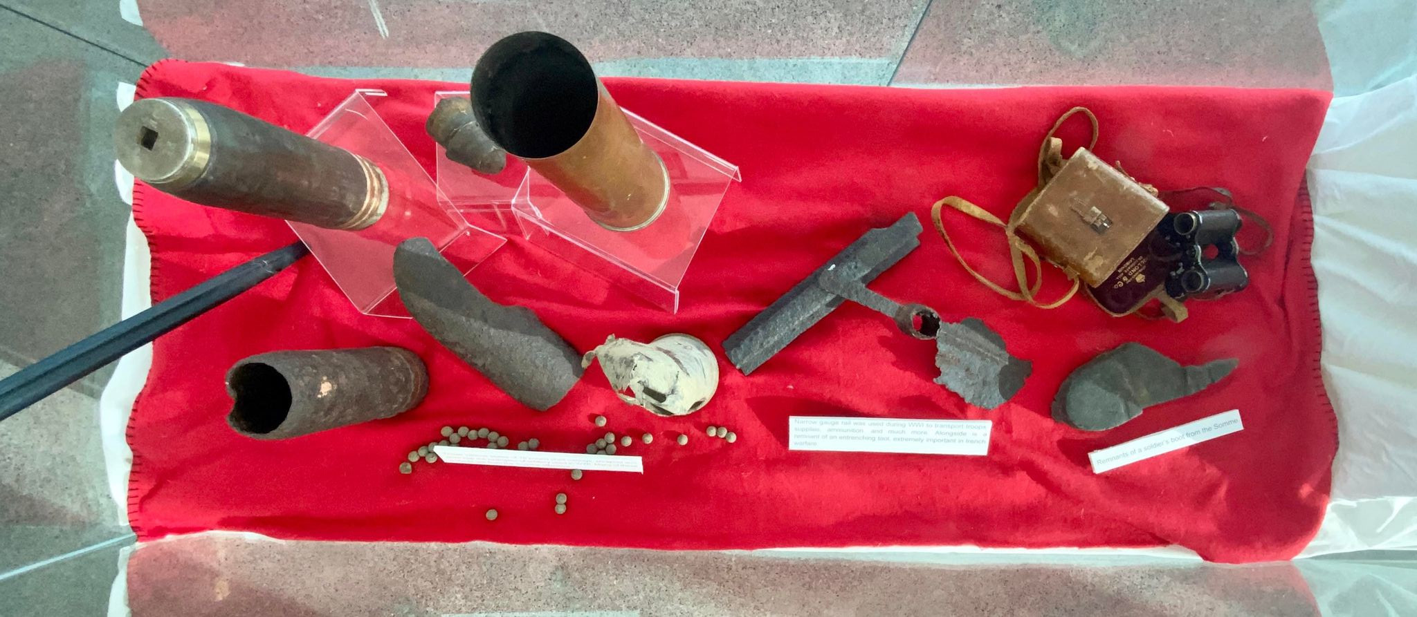 Within the first section of the display cabinet, various artifacts related to World War I were displayed. On the left were various states of 18 pound shell casings, shrapnel and nose cap, examples of artillery used in WWI. Many of these artifacts were from the Somme offensive. On the right of the display were artifacts directly related to people who served, including a set of binoculars that were manufactured in Britain, and the remnants of the sole of a boot. Narrow gauge rail was used during WWI to transport troops, supplies, ammunition, and much more. Alongside is a remnant of an entrenching tool, extremely important in trench warfare.
