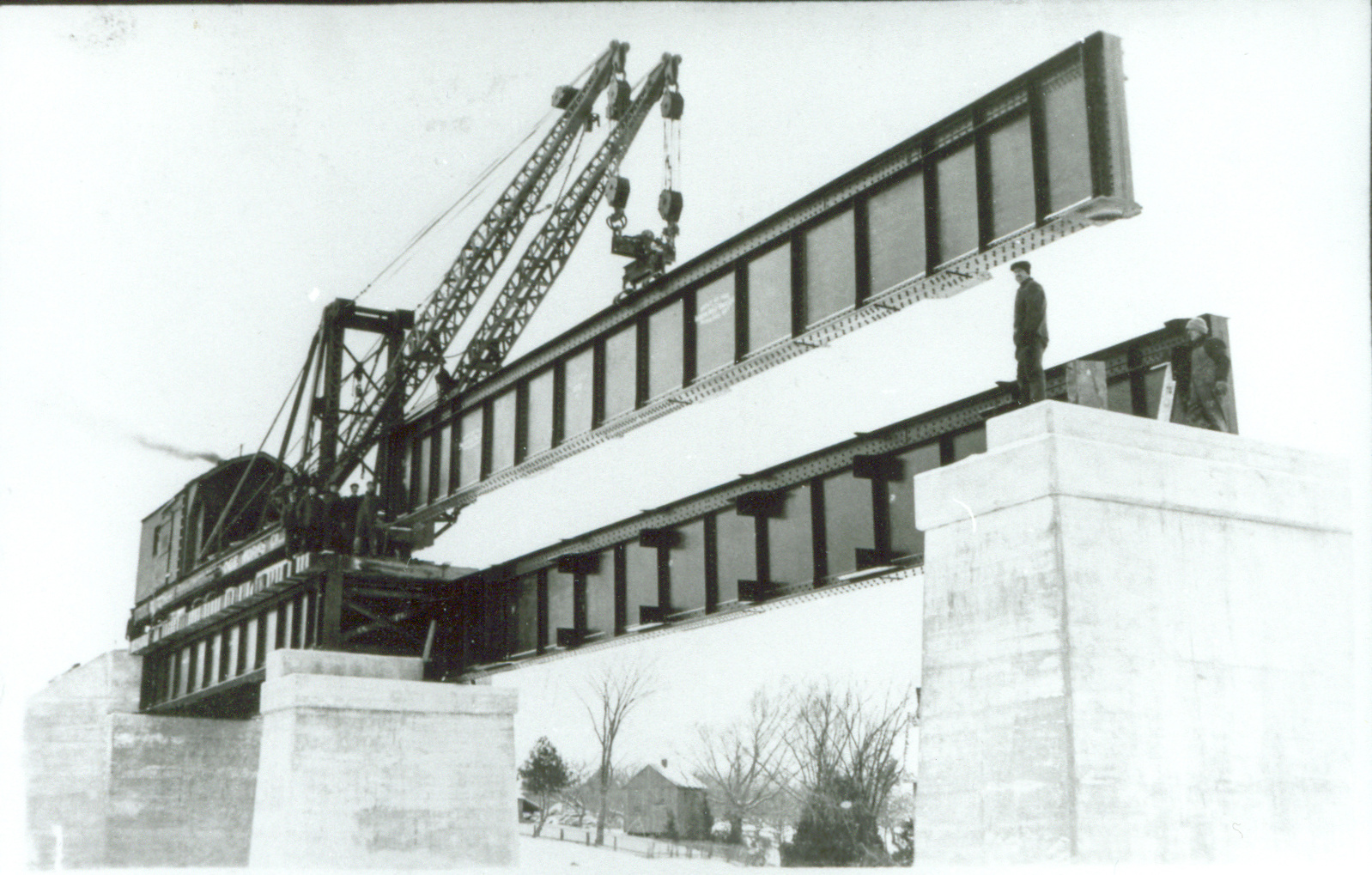 Progreston: lifting girder in place for railway line over Twelve Mile Creek, 1911