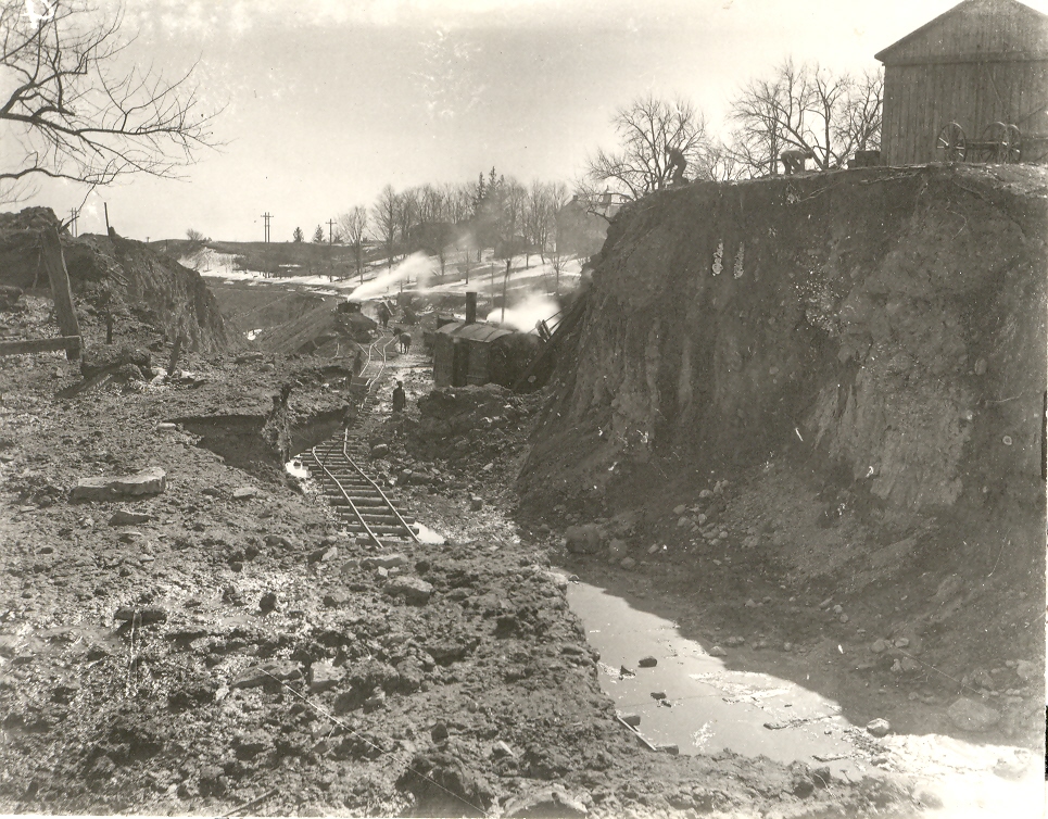 Before construction, the railway route must be determined. Trial surveys were run to compare cost and characteristics of routes, keeping the steepness of the track as low as possible. Maximum grades on the GTR in the 1850s were about one percent, while modern lines are kept below 1-2 per cent. Once a satisfactory route was surveyed and purchased, the first step in construction was to build a ‘subgrade’, the permanent foundation that supported the tract. Good drainage was and is still paramount to prevent tracks shifting. Different styles of embankments were used for different situations. Well into the 20th century earth and rock was moved by man and horse-powered equipment. Some railways used steam shovels for construction, but they were best suited for large excavations. Mechanical equipment such as bulldozers and graders does not appear to come into common use until the 1930s and ‘40s.