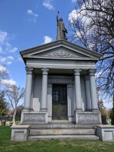 About 1880, the block-like granite marker of the present day gradually began to gain favour, slowly replacing the previous marble markers, obelisks and columns and the new metal monuments that were being advertised as the latest style of cemetery memorial. By the 1880s, many of the affluent business men, entrepreneurs and politicians in the city and even prosperous farmers in the countryside were looking for ways to portray their success in life with monuments that would reflect their position in the community and remain standing long after their demise. The result was the use of larger and larger granite blocks serving as the single marker for a number of family plots together with individual foot stones and the construction of great stone vaults and even mausoleums in which family members were interred. Both became more and more prevalent in the 1880s and 1890s. In the Hamilton York Street Cemetery, a number of wealthy families used them to display their success. Some were truly spectacular structures, such as the model of a Greek temple for the Sanford family, and a neighbouring one too the Tuckett family. Many were box-shaped houses, of little architectural value, such as the McGregor-Ross Vault in the Union Cemetery, Waterdown, for these ostentatious structures appeared not only in the city cemetery but also in the country churchyard and burial grounds of the surrounding townships.