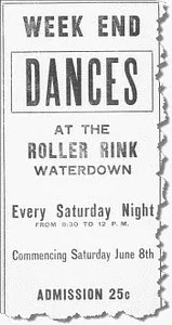 The Waterdown Amateur Athletic Association was the blanket association for many sports. “There were always crowds at the roller rink, and it was dusty and noisy. It was up on cedar posts to level it off because it was built on sloping ground; it was hollow underneath. It was really just an old wood shell, and when about 150 people were skating in there, the roar could be heard for nearly a mile away. “ Waterdown and East Flamborough 1867-1967. Waterdown East Flamborough Centennial Committee 1967, pg. 102.