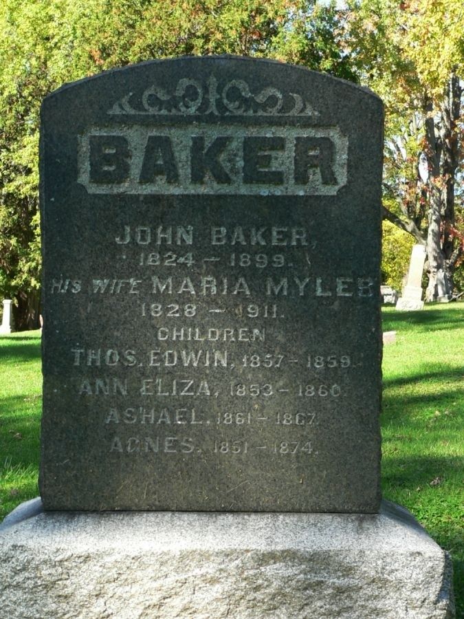 John Baker was the second of George and Mary’s eight children. Born 17 March 1824 in the original Baker log house in Bakersville, he eventually came to own two saw mills in the Grindstone Creek, a Great Lakes schooner and the Baker family home on Centre Road. He married Maria Myles (23 September 1828 – 13 April 1911) of Waterdown on 11 November 1847, and they had a family of eleven children, three of whom died in infancy and are buried with their parents in Union Cemetery, Waterdown.