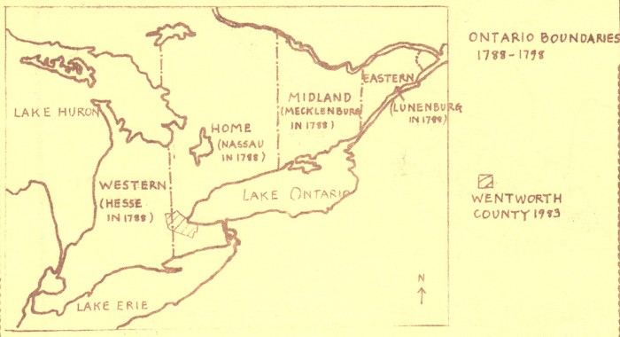 Changes occurred again in 1798 and 1802, when the Districts were further divided. The present-day area of Wentworth County still remained divided, although Flamborough Township was placed entirely within the Home District.