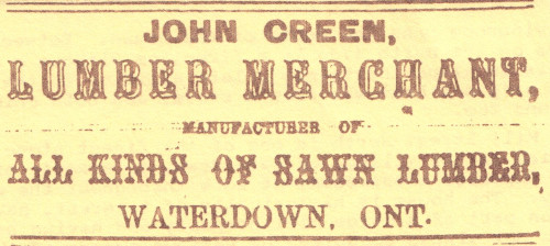 The Census of 1861 records John Creen as aged thirty-four years, a Wesleyan Methodist and farmer, with his wife Eliza and their daughter Catherine living in a one-storey frame house. In 1864, he purchased land on the Grindstone Creek upon which stood a Griffin-built flour mill, and the stone house was probably built for him at about this time, for he had now become a prominent businessman and his home reflected his position in the community. In Mitchell & Co’s, “County of Wentworth and Hamilton City Directory for 1865-1866”, John Creen is listed as the Proprietor of the Upper Mill on Mill Street, but in 1871, the property was sold again. George Washington Rymal was the purchaser, and he continued the milling business for many years. During the 20th century, the house has been home to a succession of educators and mill owners, including Dr. Riddell who was Head of Schools in Hamilton, Mr. Cooper, a principal of Waterdown High School and Mr. Walter Fielding, a past part-owner of Slater’s Mill.