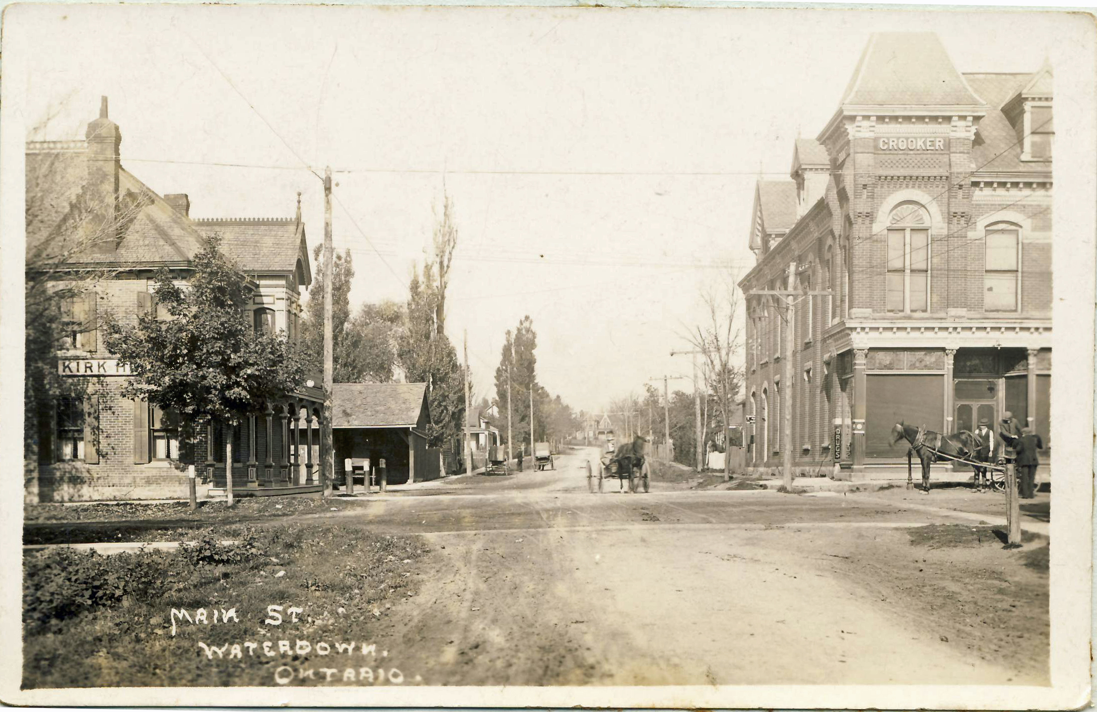 The north-east corner of Main Street North and Dundas Street has been “home” to many long-time family businesses that have been an important part of Waterdown’s history. The Crooker family appears to have operated commercial establishments in the village from the middle of the nineteenth century until 1915. In 1853, the name of Francis Crooker is recorded as a grocer and baker on one of the earliest known listings of trades and businesses in the village of Waterdown. Five years later, on the listing for 1857-58, his business appears to have expanded as he is noted as “dealer in dry goods, hardware and groceries.” It is not known if the Main and Dundas Street corner was the location of his store, but as his family name appears continuously in the Directory Listings of the village from this date onward, as merchants, general store owners and druggists, it seems most likely.