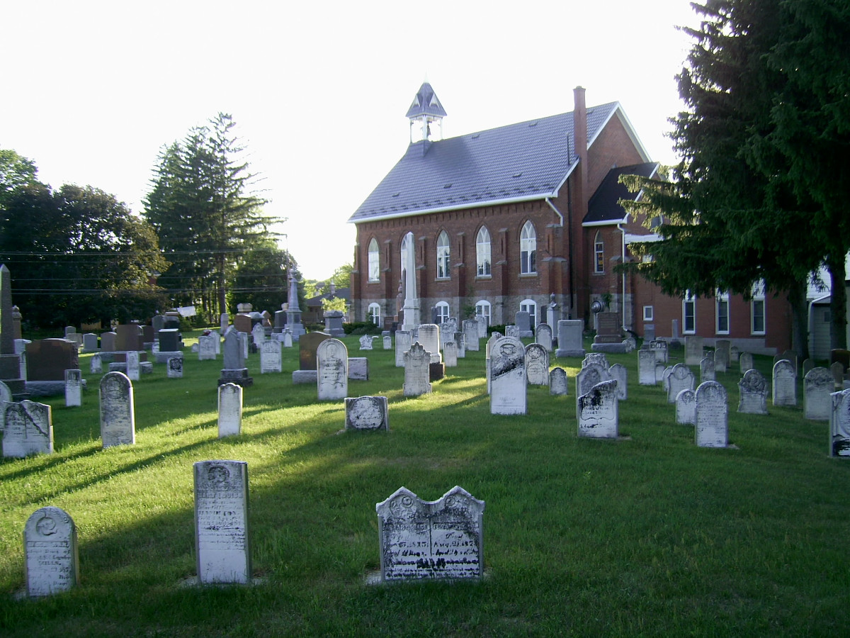 The land for the first cemetery was cleared about the same time as the pioneers were making preparations to build the chapel. A. John Sherman sold to the Methodist Church 100 acres, with registration date of 2 October 1840 — Carlisle Cemetery is part of this parcel of land. Of great interest is the original layout of the graves in this cemetery, graves being priced at four and six dollars. The names were hand-written on four wooden boards, each board approximately six inches wide and twenty-four inches in length held together by two boards nailed across the back. This layout was kept in a hand-made wooden type of envelope, keeping it dry and very secure from all possible danger.
