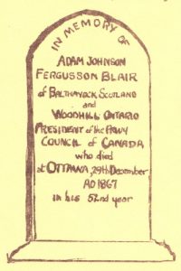 In 1865, Brown left the Cabinet and Fergusson-Blair became President of the Council. Brown “fell out” with his former friend, but Sir John A. Macdonald realised his worth, and when Confederation was finally accomplished, he appointed Adam Johnson Fergusson-Blair to the first Senate of the Dominion of Canada, and he became President of the first Privy Council, where he wielded tremendous influence in the infant nation until his unexpected death when Canada was just five months old.