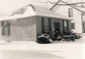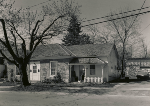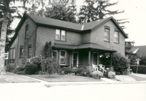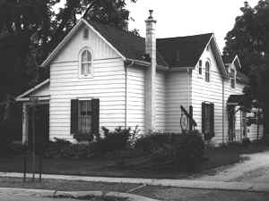 William Harris, a local blacksmith, purchased this lot in 1882 for $300.00. It is believed that the one-and-a-half storey frame dwelling was likely built at this time. The main house is L-shaped in plan with a cross gable roof. While the windows are primarily rectangular in shape, the gable end is enhanced with a semi-circular window.