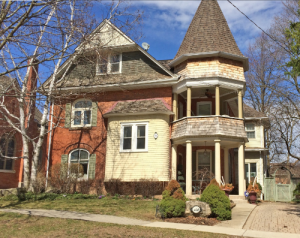 Located on the north east corner lot of Wellington and Victoria Street, this sturdy two storey red brick house was once occupied by Hugh Drummond and his family. Built around the turn of the century, this home is noted for the decorative brickwork above the windows, especially the unusual design around the large first floor bay window.