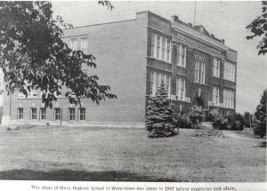 In 1918 this property, which had been used as the fair grounds, was purchased as the site of the new school since the old one in Sealey Park had become overcrowded. Opened in January 1921, this large brick school was originally called the Waterdown and East Flamborough Union School Section No. 3. The High School occupied the upper floors until 1927 when a school was constructed on the corner of Dundas and Hamilton Street. The name of the school was changed to Mary Hopkins in 1964 in honour of the first teacher in Waterdown.