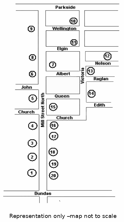 Since the tiny cottages along Nelson Street are located close to the banks of Grindstone Creek, they were often occupied by mill workers. Nelson and neighbouring Raglan Street were laid out in the McMonies and Stock Survey of 1856. This area is known locally as “Dutchtown”, a corruption of Deutschtown, probably because many of the early families who found work in the mills were of German origin. Many of the houses along this street have been beautifully renovated.