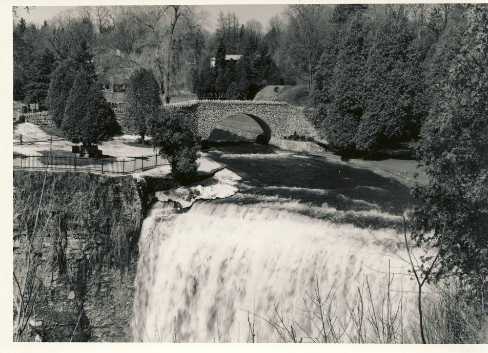 At the beginning of the twentieth century, declining water power and various industrial fires heralded the end of its industrial importance. The Bank of Hamilton, which held several mortgages on the property, sold the site to the Corporation of the Town of Dundas in 1917, on the condition that it be used as a park. The land around Webster’s Falls was slowly transformed into an attractive site, but the economic conditions of the 1920s limited the work the Town of Dundas was able to undertake. The Parks Board removed the old wooden dam that had served the Ashbourne Mill and extended the stone section in the form of a rustic bridge over the Spencer Creek.