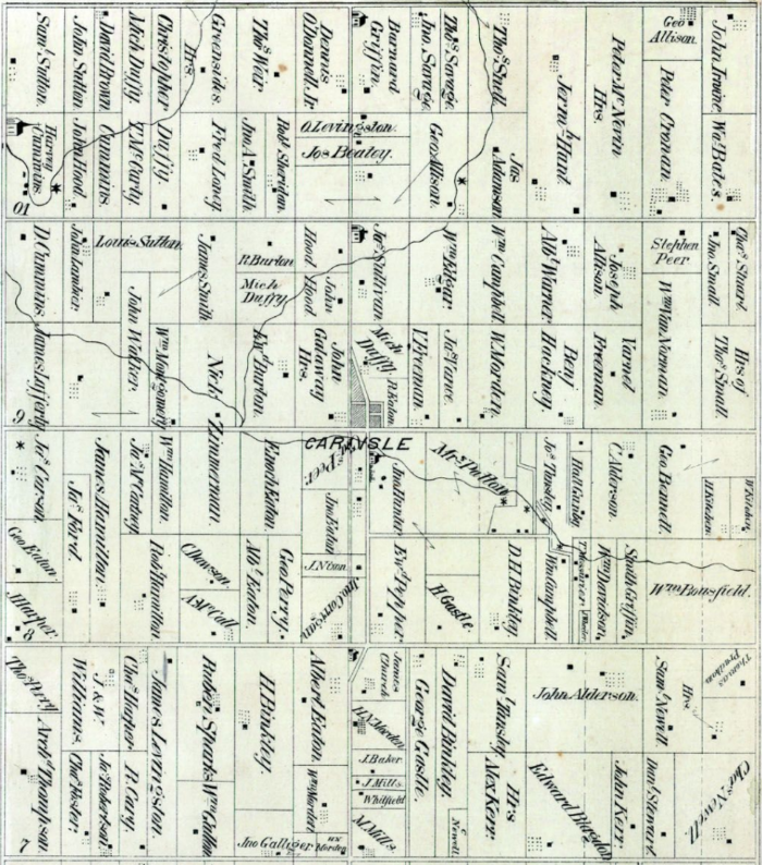 Progreston is a village in the Township of Flamboro’ East on lots four and five in the eighth concession, about one mile from the village of Carlisle, eight miles from Waterdown Station, Great Western Railway, and twelve miles from Hamilton. It was first settled by George L. Beardmore, now of the city of Hamilton, and was laid out as a village by William Campbell, James Kievell, Joseph Tansley and Andrew Patton. A road has lately been surveyed from Milton, the county seat of Halton, to pass through the village, and intersect the gravel stone road leading to Hamilton. The Twelve Mile Creek here furnishes an abundant supply of hydraulic power, which is made available in propelling the machinery of a peg and last factory, two grist mills (one nearly completed) and three saw mills. In the peg and last factory, about twelve hands are employed. In Campbell’s saw mills there are five hands, who turn out about four hundred thousand feet of sawn lumber per annum. The other saw mills also turn out a large quantity, and employ a number of hands. There is one church, the “Messiah”, erected of frame in 1863, which will accommodate about two hundred persons — Rev. Daniel Campbell, minister. Population 100. No post office yet established.