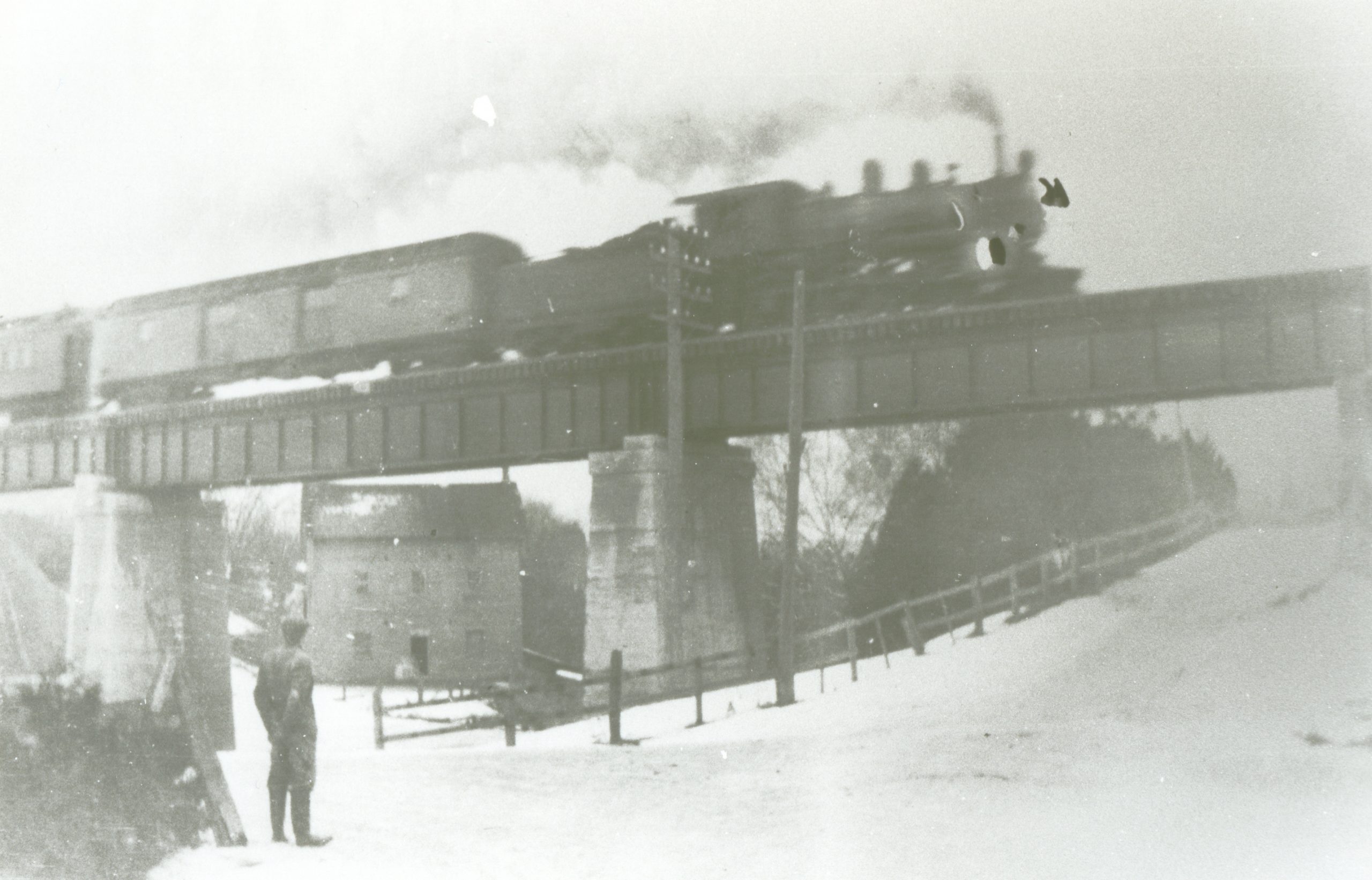 Green Spring Road narrows and passes under the Canadian Pacific Railway Bridge. The imposing stone bridge, with its span over the Twelve Mile Creek and Green Spring Road, is one of the landmarks in the village. This stretch of the Canadian Pacific Line between Guelph Junction and Hamilton was built during 1906, and on July 1, 1912, the first passenger train passed through. There has never been a station in Progreston, the stop at Flamboro Station (just off the Carlisle, or Ninth Concession Road), less than half a mile away, serving the village and Carlisle. Four trains daily to Hamilton allowed farmers to take produce to market, and high school students to take the train to Waterdown. Howard Green used the train daily to attend Hamilton Business College for a year before joining his father as a salesman for the Progreston Woollen Mill.1