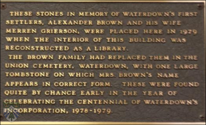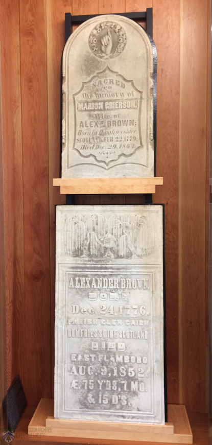 Over the next several months, arrangements were made by the Waterdown Centennial Committee and The Waterdown-East Flamborough Heritage Society with the Wentworth Library Board and architect Carl Rieder to have them placed on an interior wall of the library. This building was the former East Flamborough Township Hall and as a Centennial project was being renovated to become the Waterdown Library. In 1979, as the interior work was completed, the Brown tombstones were mounted on the wall beside the elevator and their preservation was assured.
