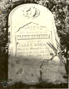 Merren Grierson wife of Alexander Brown Born in the parish of Glencairn Dumfriesshire, Scotland 22 February 1779 Emigrated to Canada 1806 Died 29th December 1863