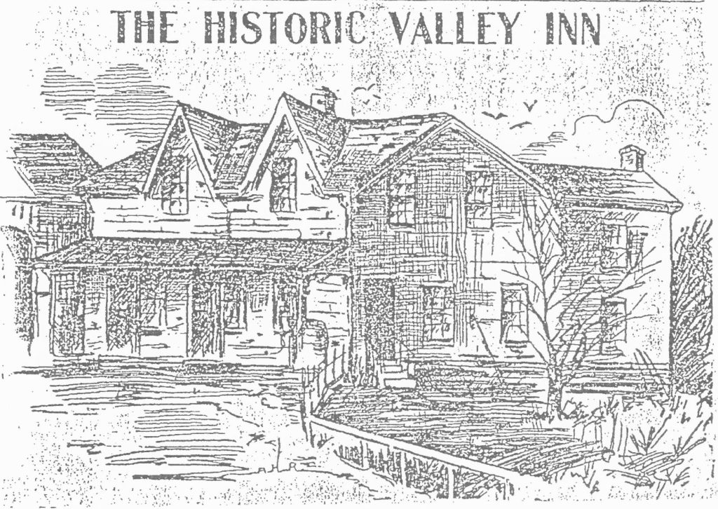 Reputedly built by John Yakes of East Flamborough, the hotel was a two-storey frame structure with a magnificent verandah running the whole length of the front facade – it is interesting to note that prior to becoming the owner/operator of the hotel, John Yakes had married Mrs. George Baker of Bakersville, East Flamborough Township, and the Baker family home on Centre Road also has a very fine verandah that stretches the length of the front facade and was built just a few years earlier than the Valley Inn Hotel.