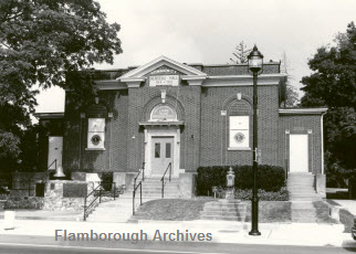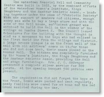 During the war, funds had been collected by the “Patriotic Society”, a group made up of the Waterdown Women’s Institute, the King’s Daughters and the Amateur Athletic Association. Using residual funds, the Waterdown Women’s Institute purchased the site at 317 Dundas Street East, in 1920, and turned the property over to the Waterdown Council.