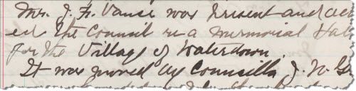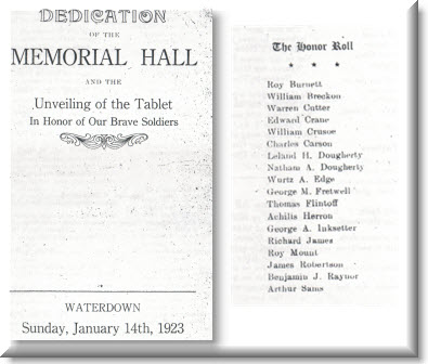 The earliest reference to the concept of a Memorial Hall is in the Waterdown Council Minute Books, February 10, 1919, when Mr. J.F. Vance ‘addressed the Council re a memorial Hall for the Village of Waterdown’.