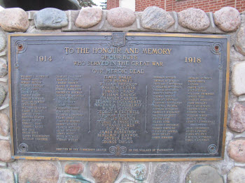 During the service, a commemorative tablet containing the names of all villagers who had enlisted in the war and the 19 who had died, was unveiled. In the centre are the names of nineteen boys who died in action, and the names of those who survived form a border. “The Rev. Father Becker was to have taken part in the services, but owing to an accident on Guelph Road, he was unable to attend, being confined to his bed in the Guelph hospital” (Waterdown Review article Jan. 25, 1923). In total, Waterdown sent 108 men and women overseas during the First World War