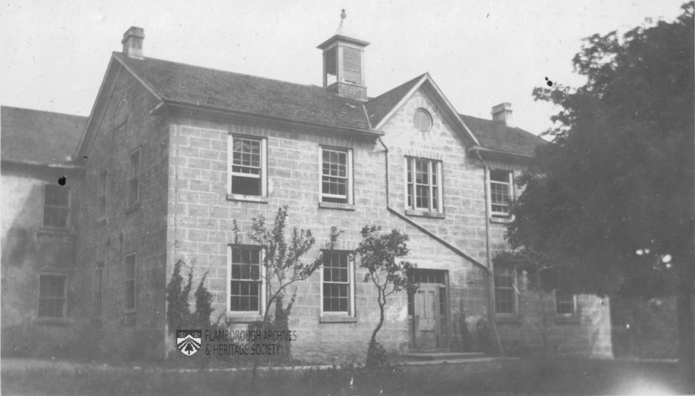 During the 1840s, the work of Egerton Ryerson, Superintendent of Education, resulted in the establishment of Common or Public Schools throughout the province and by 1849, such a school was operating in Waterdown. In 1854, trustees for a Grammar or High School were listed in the same Minute Book as those appointed for the Common School. Following a public meeting in 1867, East Flamborough Township Council was authorized to purchase property for a new school. The site, located at the southern end of Main Street, was part of Ebenezer Griffin’s estate, with views of Hamilton and Burlington Bay. Later the same year, a two-storey stone schoolhouse to accommodate both schools was built, with landscaped grounds and a student play area.