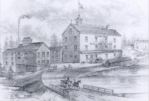 Between 1819 and 1822, the 200 acres of Lot 11, Concession 1, which included the area around the Falls, was acquired by Joseph Webster Sr., a half-pay British officer whose family began a long association with the history and industrial development of the site, and as a result, their name is forever associated with the waterfall. The family owned and operated the Ashbourne Roller Mills directly above the falls. This large-scale complex, begun in 1830, consisted of a dam, mill pond and milling complex of a grist mill for peas, barley, and oats and a distillery. It was enlarged two decades later to include a cooper shop for the production of flour barrels and another mill for the production of cotton batting. Above the main entrance to the mill was an enormous lintel with a carved sheaf of wheat and the inscription “Speed the Plough”.